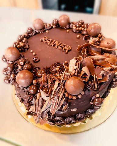 > Full-size party cakes with buttercream or chocolate decorations